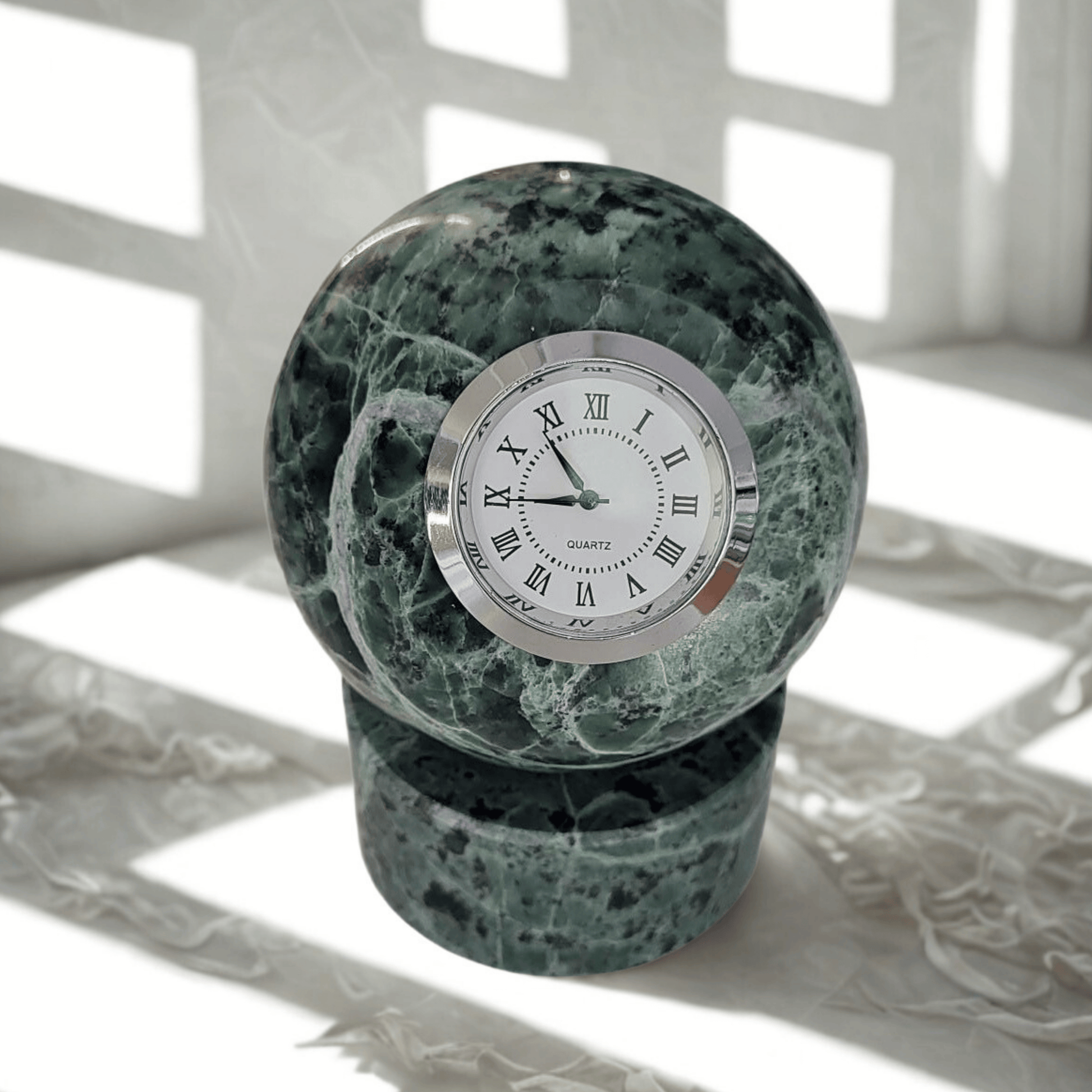 Our clocks are handcrafted by local stonemasons who, with passion and experience, transform this natural treasure into masterpieces. This combination of the unique structure and color of antigorite serpentinite with the knowledge of our craftsmen gives an amazing effect that will perfectly complement the decor of your office or living room.